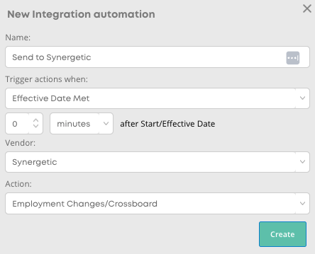 You will then need to configure the automation. Name the automation to suit your organisation. The Trigger Actions dropdown contains two options, Effective Date Met should be selected to avoid pushing data too early in the process. A delay can be set to this. Select Synergetic as the Vendor. When clicking the dropdown on the Action field, select Employment Changes/Crossboard or Off boarding, depending on which workflow you are working on.