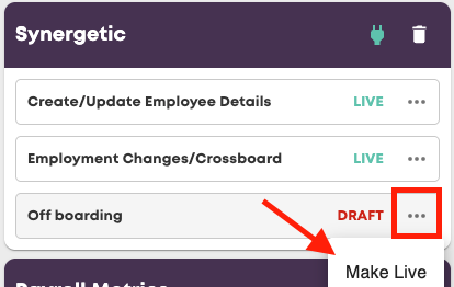Then you can setup the Employment Changes/Crossboard or Off boarding Synergetic action. You will need to map existing fields in your Martian Logic account to the Action. If you require assistance with this contact support@martianlogic.com or your Martian Logic account manager.
