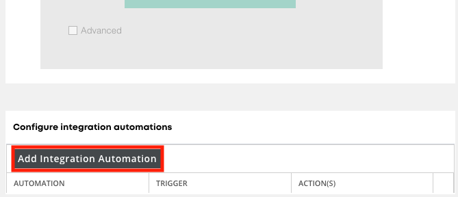 Once in the workflow setup screen, scroll to the bottom to the Configure integration automations area. Select Add Integration Automation.