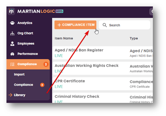 Select +Compliance Item from the top left of the screen