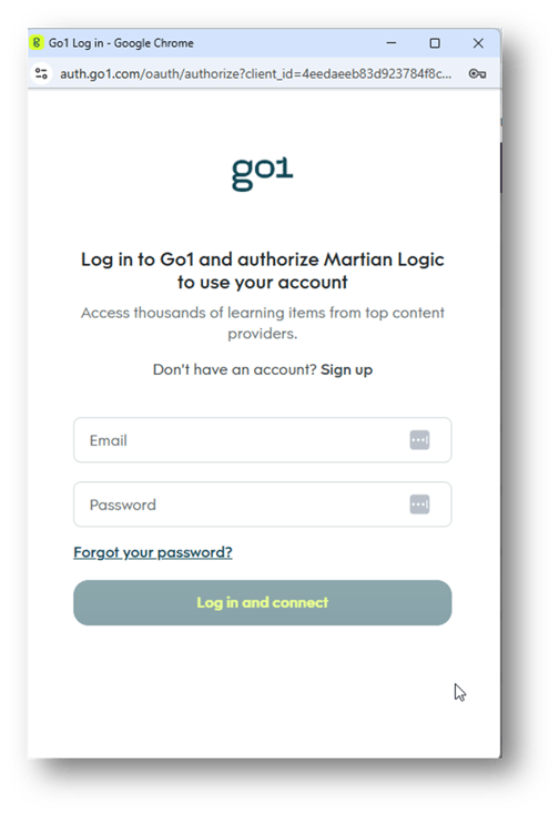 A browser will appear. Enter your GO1 Email Log in and Password and select ‘Log In and Connect’.