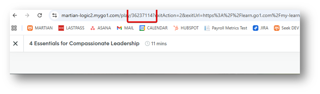 Once you have added content to your learning library, click start on the content piece. The code will appear in the URL: