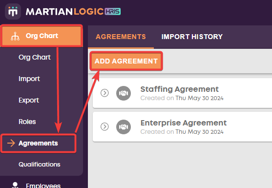 To import your agreement data into the agreement section in Martian Logic, create an Award/Agreement name first by clicking on Org Chart > Agreements > Add Agreement.