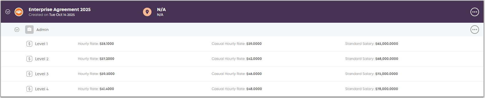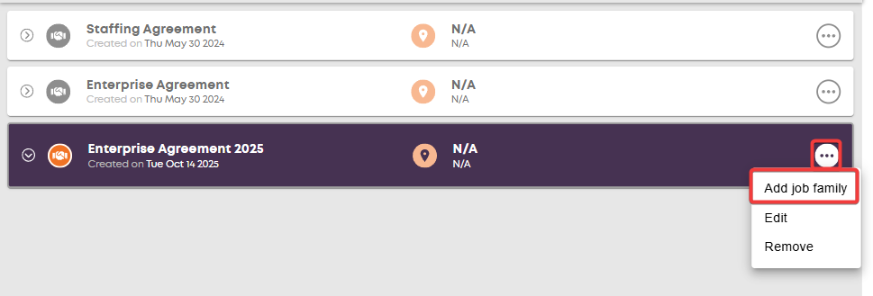 Once that is created, click on the 3 dots on the right of the new agreement and click Add job family.