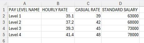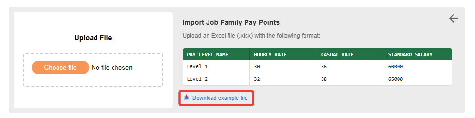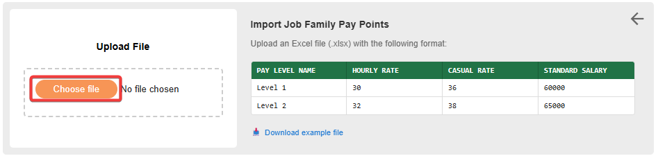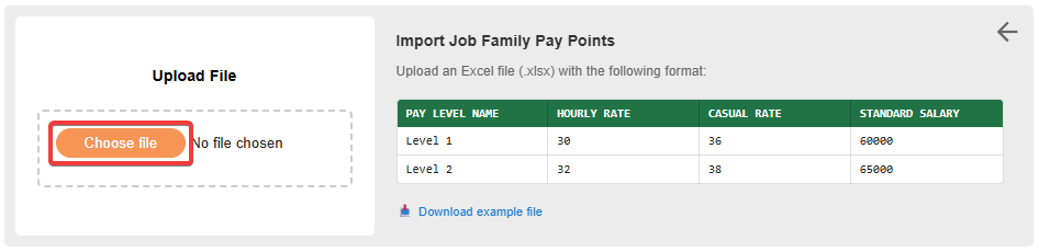 When all your pay levels are entered. Save the file, and upload it into the Upload file section by clicking Choose file.
