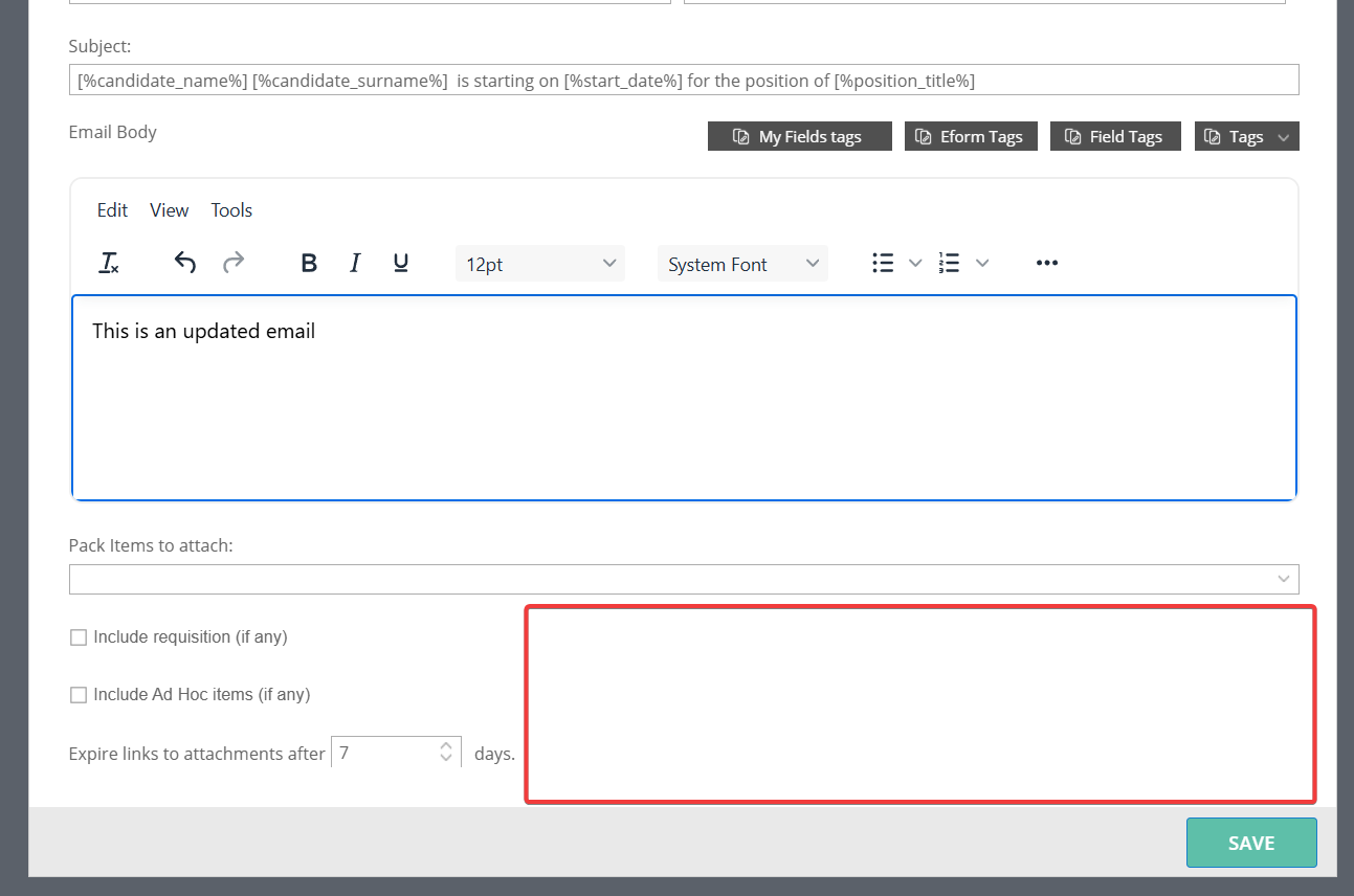 4. After you edit the email, click anywhere on the white space boxed below, then click save.