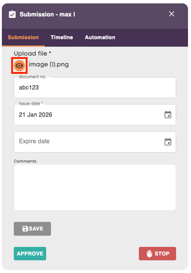 From here, you can view any uploaded files, verify the submitted details and amend/add comments if needed. If you are happy with the check, you can press 'Approve'. If not, you can press 'Stop' and the employee will remain non-compliant for that check. If the check is still needed, you will need to re-assign the item to the employee.