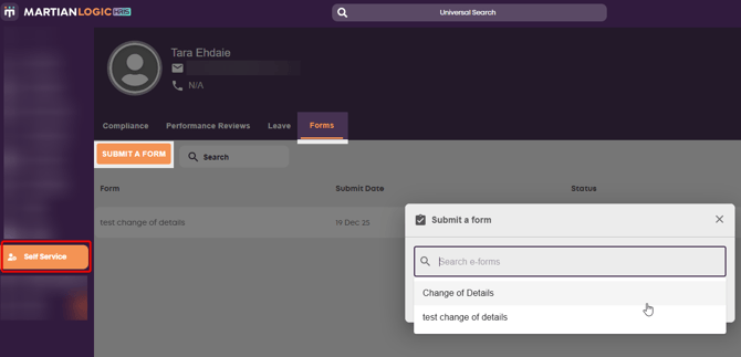 The form that was made live, will now appear from the drop down menu of an employees self service portal, under 'Forms'
