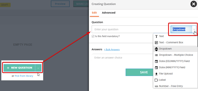 If you wish to create a new field, select 'New Question' and create your field type then save.