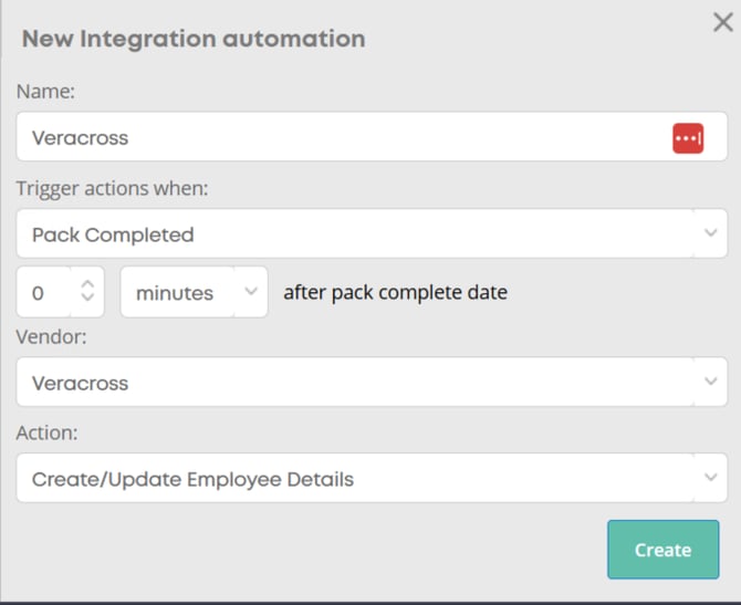 Then give the integration automation a name in this case "Create Employee" seems sensible. Then select Veracross as the vendor and the Create/Update Employee Details action we setup previously.