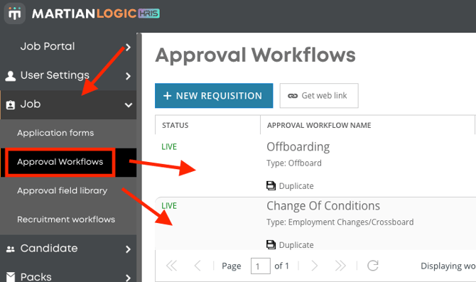 Then, navigate to Job -> Approval Workflows and select either the Offboard or Employment Changes/Crossboard workflow type.